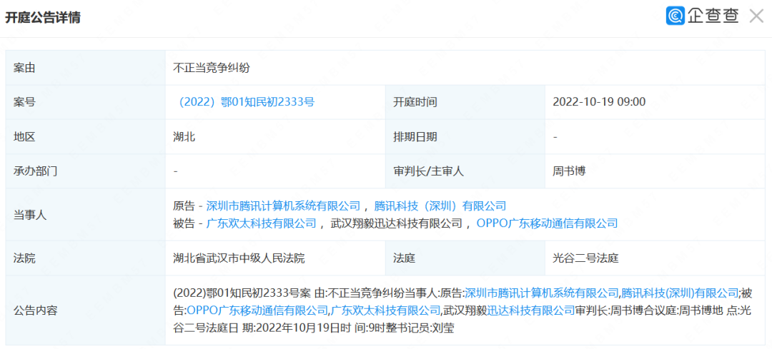 被告方为OPPO广东移动通信有限公司、广东欢太科技有限公司、武汉翔毅迅达科技有限公司,该案将于10月19日在武汉市中级人民法院开庭。