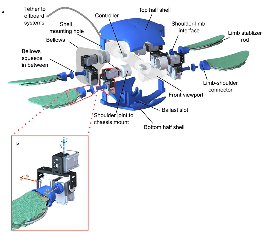机器龟的身体有一个变形肢体,能够根据环境调整其硬度和形状。身体包括四个子系统:底盘、外壳、肩关节和变形肢体。底盘容纳电子元件,外壳提供流线型、用于浮力调整的压载空间、有效载荷存储和保护。肩部关节在运动学配置中各有三个马达,以实现一系列的步态。