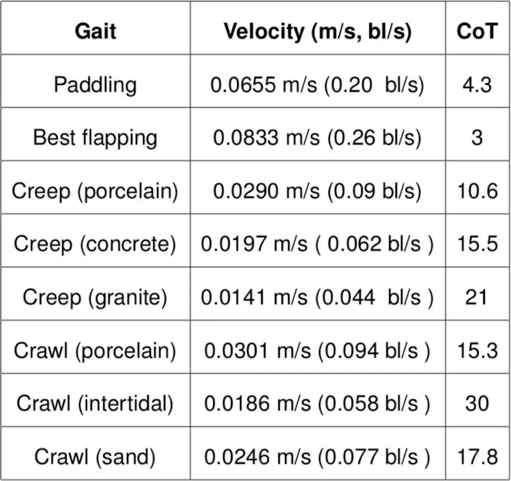 机器龟使用腿部模式和匍匐前进的方式来穿越坚硬的土壤部分。当机器龟接近水面时,基质变得更加饱和,它开始爬行,以确保稳定性,防止直立步态的集中点负荷深入到基质中。机器龟并没有在开阔的水面上走很远,在变形之前,它把四肢抬出水面。当它在浅水区仅部分被淹没时,它依靠划水来游泳。到达水域后,机器龟就将腿变成鳍状肢,使其能够以基于升力和阻力的水上步态进行畅游。