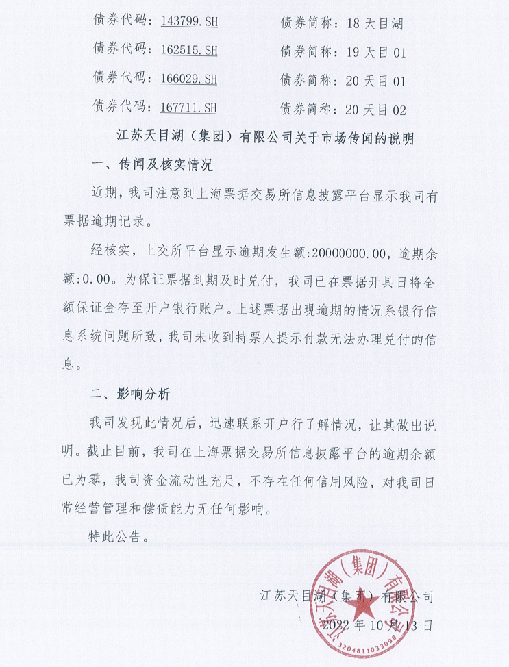 10月13日,江苏天目湖(集团)有限公司发布关于市场传闻的说明:近期,我司注意到上海票据交易所信息披露平台显示我司有票据逾期记录。经核实,上交所平台显示逾期发生额:20000000.00,逾期余额:0.00。为保证票据到期及时兑付,我司已在票据开具日将全额保证金存至开户银行账户。上述票据出现逾期的情况系银行信息系统问题所致,我司未收到持票人提示付款无法办理兑付的信息。