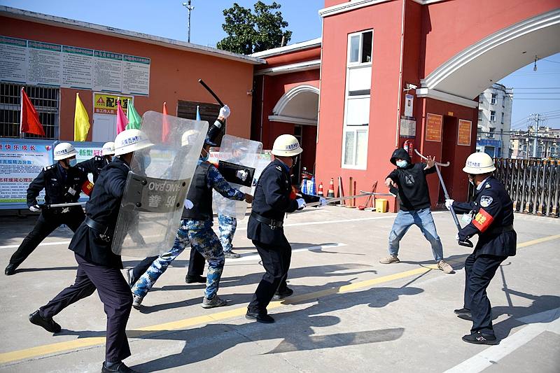 本次演练设置“反恐防暴”和“校园踩踏”两个场景。随着局法安股张忍军一声令下,反恐防暴应急演练正式开始。一名“暴徒”以看望学生为由,想方设法进入校园,在保安的询问下暴露了身份,“暴徒”手持凶器,翻越护栏门冲进校园,欲对师生实施侵害。校门口专职保安员见状,立即上前阻止并进行缠斗,另一名安保人员立即按响一键报警按钮,并在第一时间拨通校长电话,报告歹徒入袭方位,后迅速拿起钢叉参与到与歹徒的搏斗当中。随着校园警报响起,上课教师立即组织学生撤离操场。学校教管快速反应,互相配合,迅速将“暴徒”制服,协助迅速到场的110警察将其拘捕。