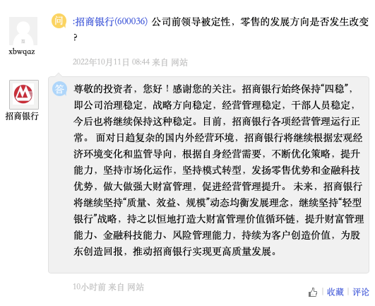 这个问题招行给出了回复。从招行的回复来看,招行依然会坚持“四稳”,即公司治理稳定、战略稳定、经营管理稳定、干部人员稳定。说白话就是前任的问题更多还是被定性到了个人身上,对招行既定的方针并没有大的影响。而招行也表态了继续坚持“轻型银行”战略,持续打造大财富管理价值循环链。