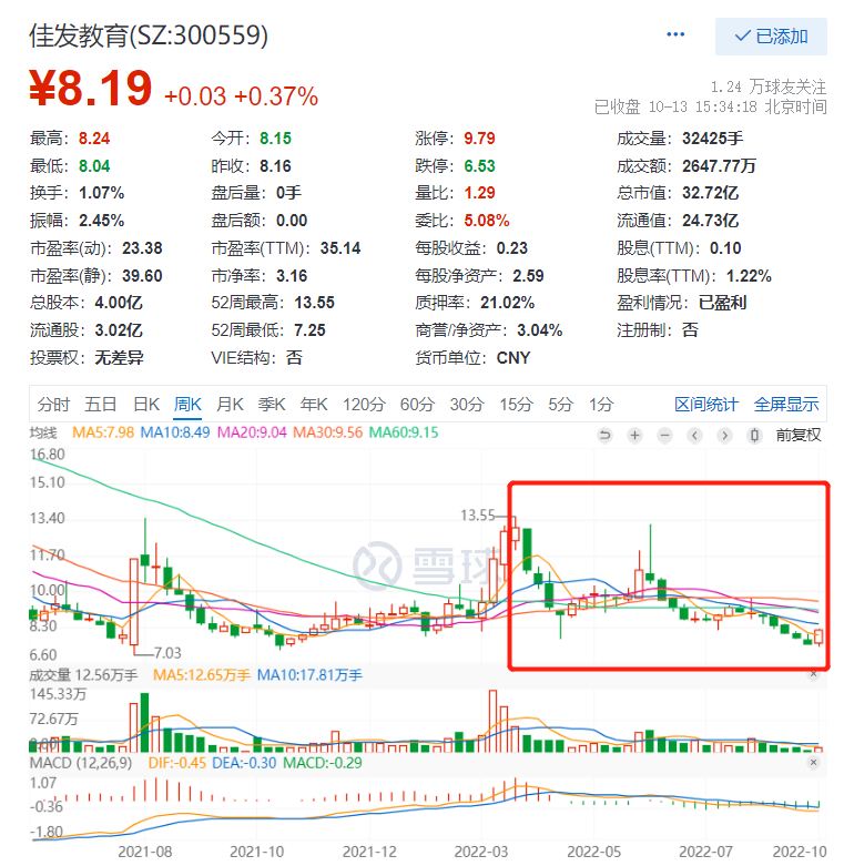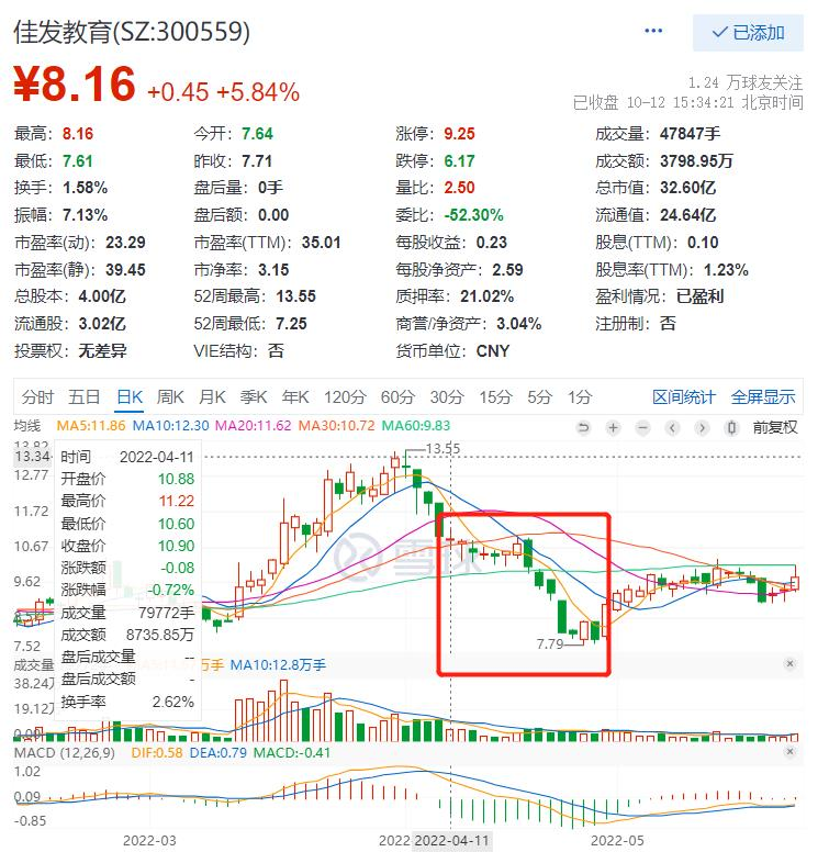 业绩下降,显然影响到了市场对佳发教育的信心。公布年报后,公司股价持续走低,从10.39元/股一路跌至最低7.79元/股。直到4月27日后,股价才开始回升,这或许和2022年一季度报告公布有关。今年Q1佳发教育实现营收9153.38万元,同比增长67.06%,归母净利润也同比大涨209.15%至1512.8万元。