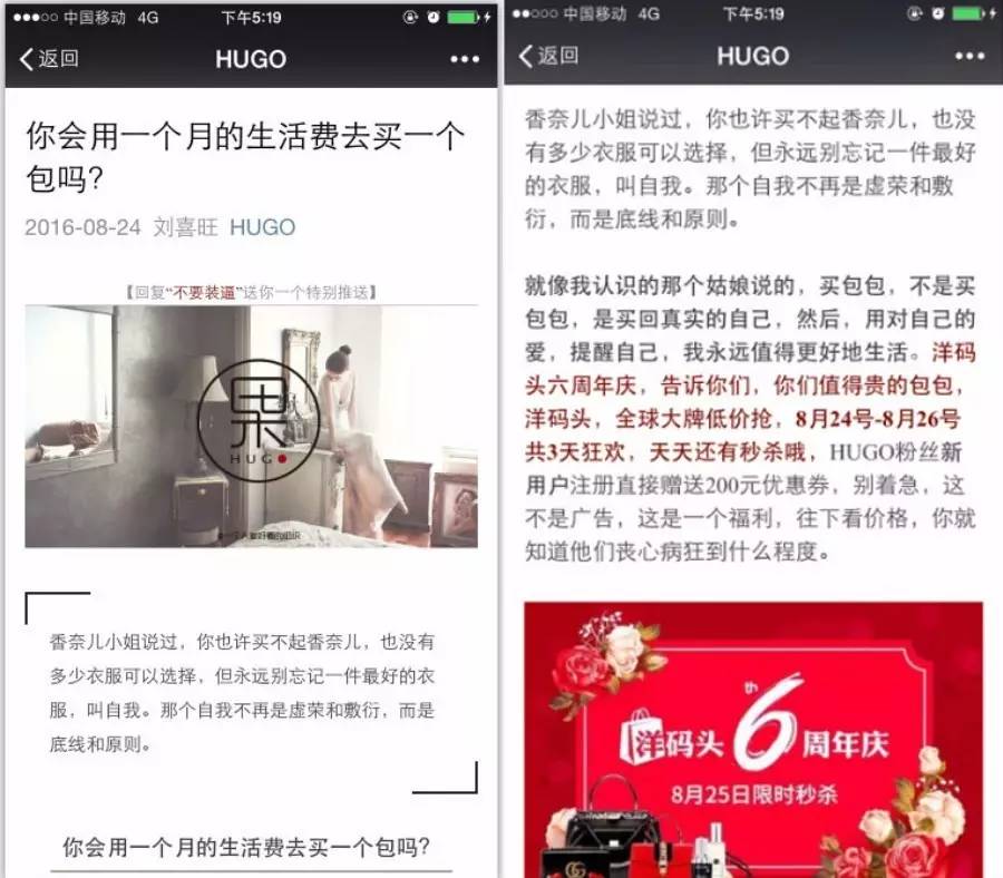 让我们来看看微信大号HOGO是怎么卖包的。软文的标题叫《你会用一个月的生活费去买一个包吗?》,文章洋洋洒洒数千字讲了数个故事,情绪浓烈,通篇都在宣扬一种价值观“女人买包不是虚荣,而是给自己的生活带来尊严”以及“再穷也应该买一个好包,这是热爱生活的体现”,为女性购物提供一个理由,然后再让她们在文章结尾看到某电视平台名牌包促销的信息。