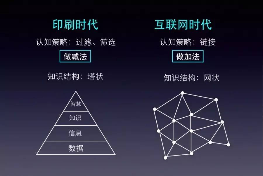 这时,大脑认知世界的基本策略是过滤、筛选,即通过“做减法”来获取知识。知识的形状呈“数据-信息-知识-智慧”的金字塔形状。互联网时代,情形改变了,电脑储存信息既海量又廉价,大脑认知策略变为对知识的链接,人们通过“做加法”来获取知识,知识的形状呈蜘蛛网状。