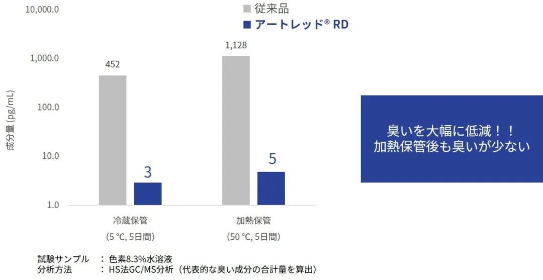 同时,通过在50℃下进行长达5天的加热试验表明,传统的红萝卜色素异味成分增加了约2.5倍,而Artred RD的异味成分几乎没有增加,不存在返臭风险。