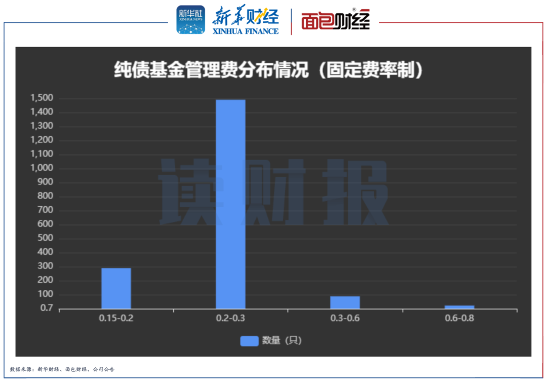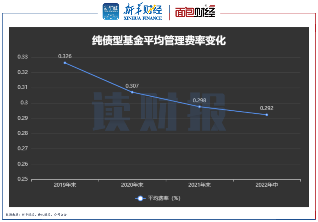 新华财经和面包财经的研究显示,最近两年纯债型公募基金产品的平均管理费率处于下降趋势。数据显示,当前市场存续的固定费率制纯债基金的管理费率平均值为0.29%,管理费率档位主要集中在0.15%、0.30%。