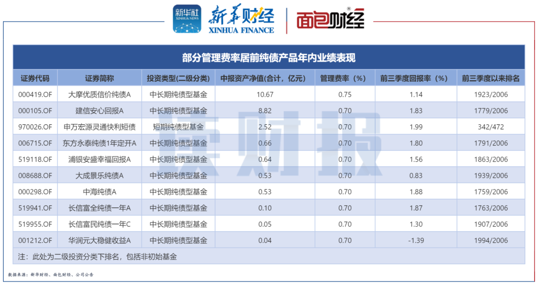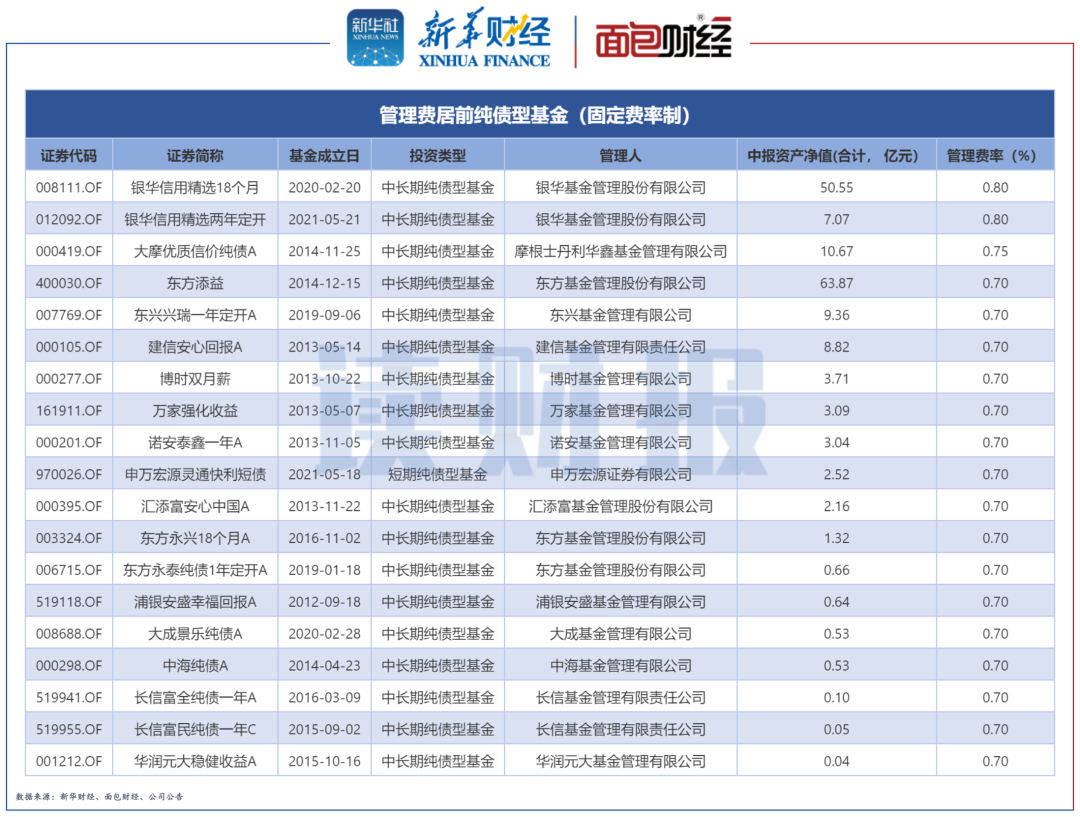 管理费率不低于0.7%的固定费率纯债基金中,规模在10亿元以上的产品共3只,包括银华信用精选18个月、大摩优质信价纯债及东方添益。