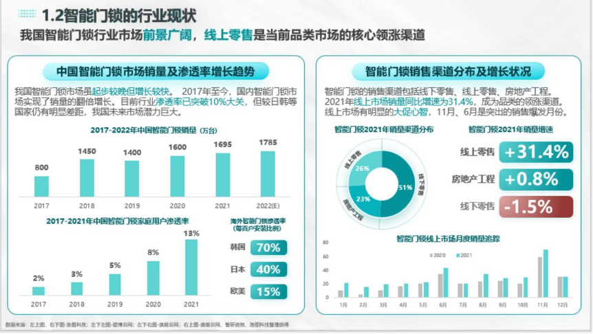 智能门锁市场已经走过最初的市场教育阶段,迈入快车道。据《TMIC:2022年智能门锁行业趋势报告》,2017年至今,国内智能门锁市场销量翻倍增长,2021年销量达1695万台,线上市场增速超30%;行业渗透率达13%,相比韩国70%、日本40%的渗透率,还有相当大的空间。