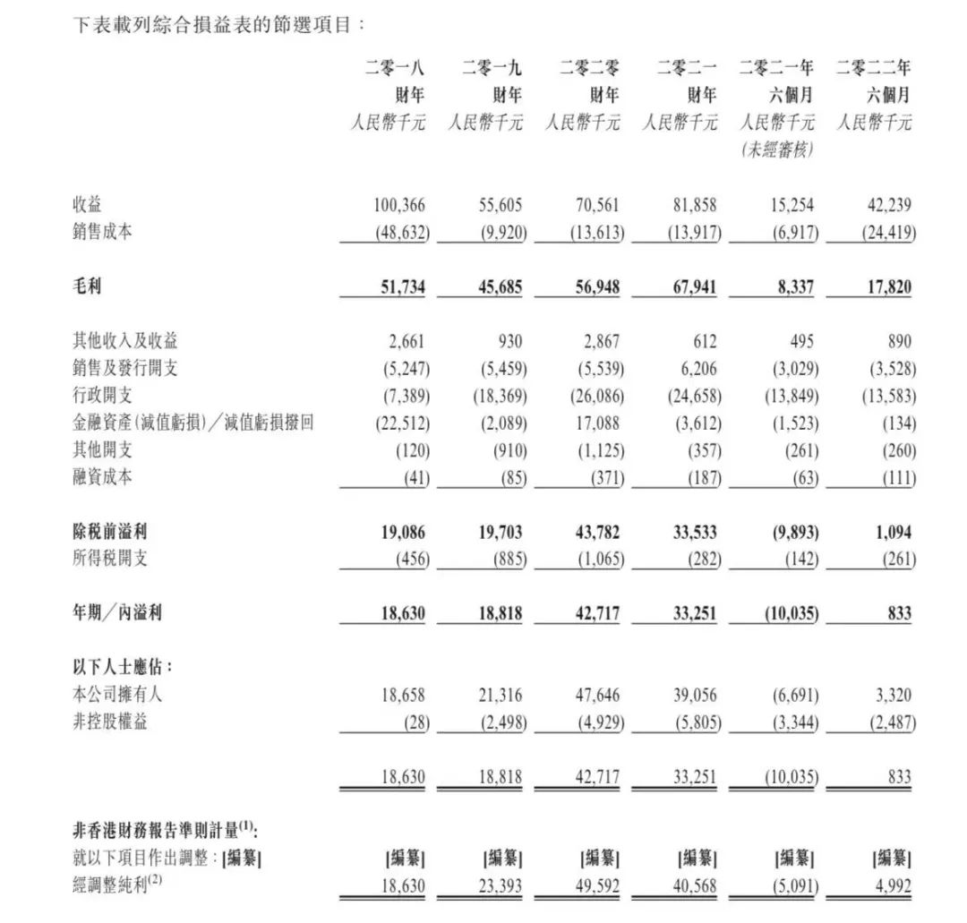 招股书显示,2018~2021财年,风华秋实收益分别为10036.6万元、5560.5万元、7056.1万元、8185.8万元,2022年前六个月收益为4223.9万元。营收虽有反弹,但纯利率方面并不明朗,2018~2021财年,纯利率分别为 18.5%、 33.8%、 60.5% 、40.6%,但2022年上半年,纯利率暴跌至2.0%,录得溢利仅83.3万元。