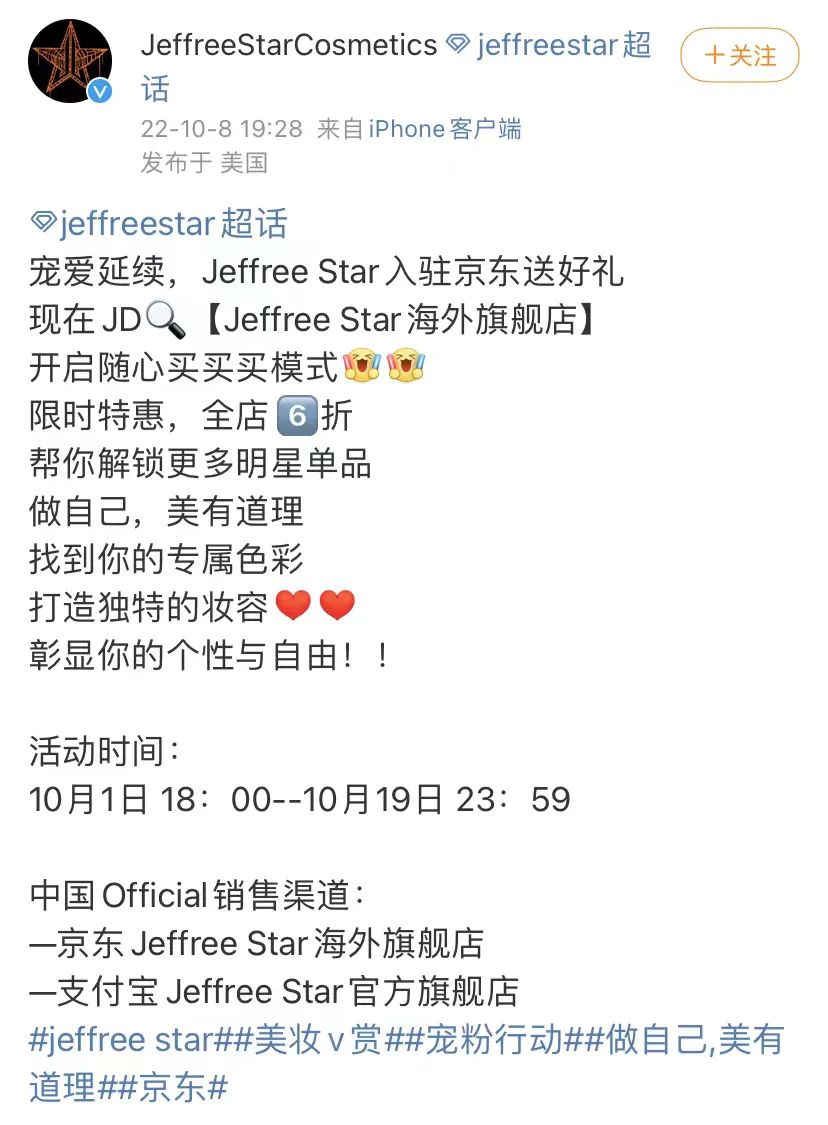 日前,全球最具影响力美妆博主之一Jeffree Star的个人彩妆品牌Jeffree Star Cometics宣布进驻京东平台。在中国的社交媒体平台,品牌官方微博写道,“做自己,美有道理,找到你的专属色彩”。此前,该品牌已经通过海外渠道进驻天猫。