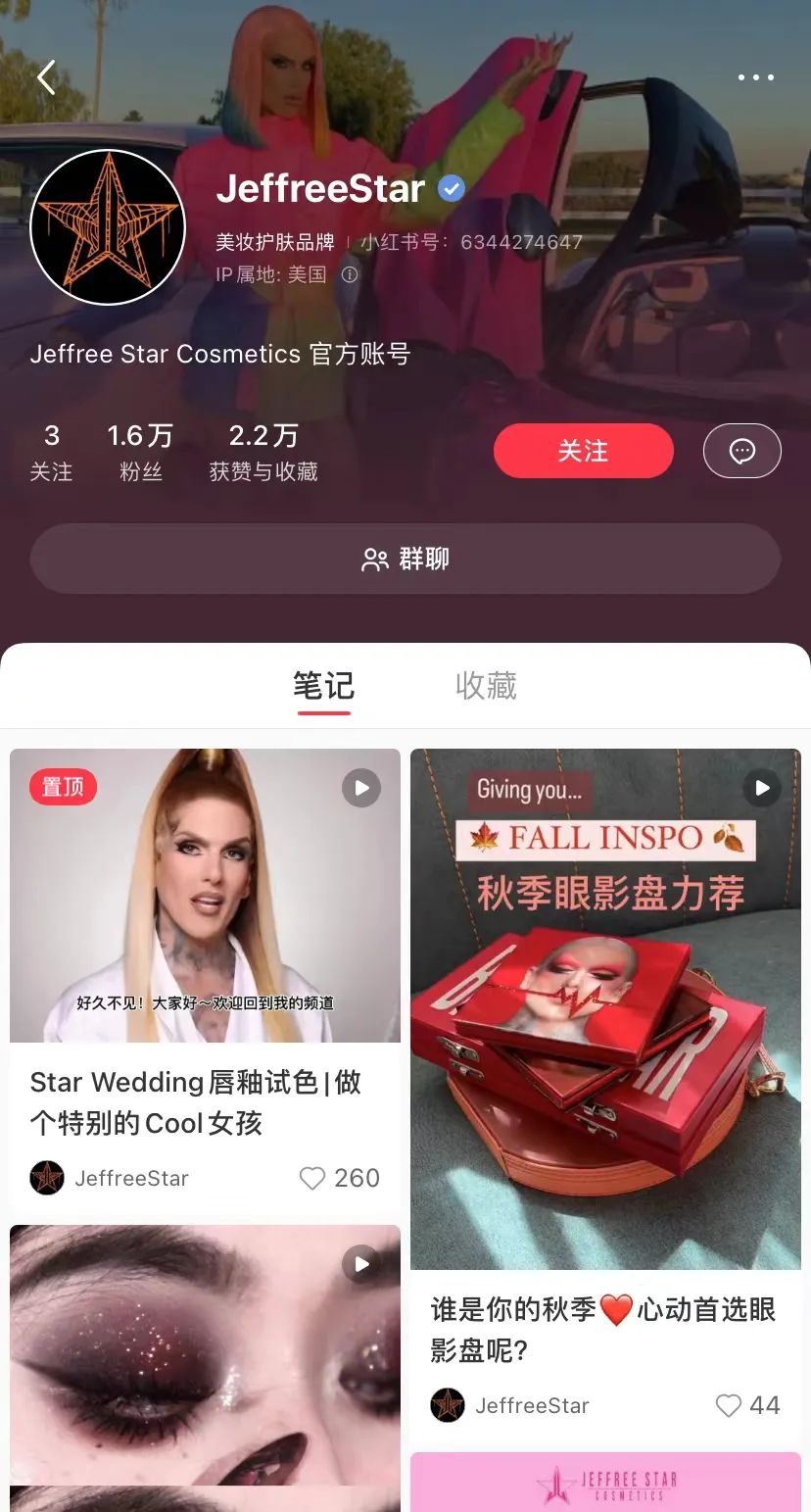 《化妆品财经在线》记者发现,今年以来,Jeffree Star陆续低调地一改往日风格,在中国开通了微博、小红书等社交媒体的个人和品牌官方账号。截止到记者发稿,其个人小红书账号粉丝1.6万,品牌微博官方粉丝不足1万。