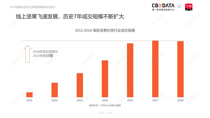 随着互联网蓬勃发展,炒货品牌们开始盯上电商渠道。2010年,百草味率先做出改变,砍掉160家线下店并入驻淘宝。2012年,三只松鼠成立并抓住电商红利迅速发展,依靠主打健康理念的坚果和线上渠道的性价比优势占领了消费者心智。此时,“树坚果”开始成了国人炒货消费中重要的品类。2015年沃隆推出热门单品“每日坚果”后,坚果市场进一步扩张。CBNData《2019坚果炒货行业消费洞察趋势白皮书》就显示,仅在淘系平台,线上坚果炒货行业成交规模在2012到2018年间就翻了10倍。