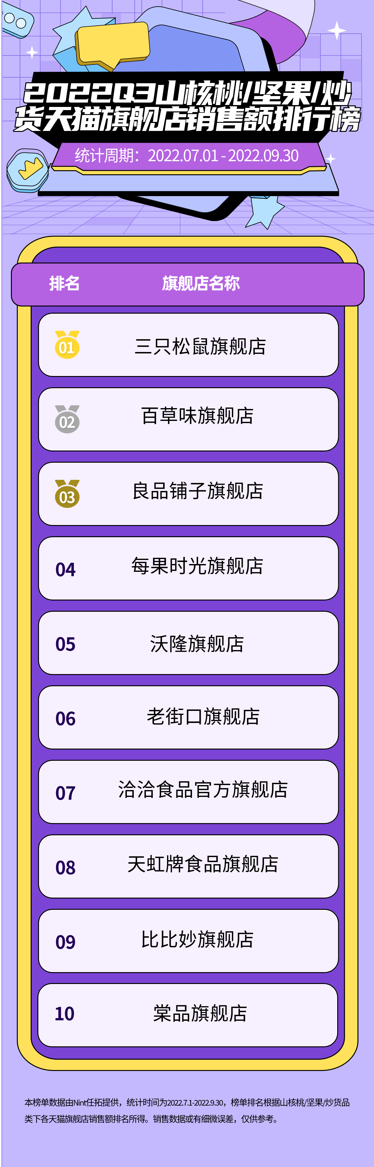 时至今日,代表健康的混合坚果依然是炒货市场的“大品类”。尤其每逢节庆,各炒货品牌的礼盒套装销售格外火爆。结合Nint任拓数据,C站排出了2022Q3山核桃/坚果/炒货天猫旗舰店销售额排行榜: