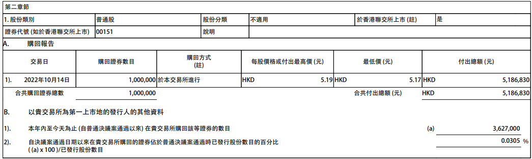中国旺旺10月14日在港交所公告,当日耗资约518.68万港元回购100万股公司股份,回购价格每股5.17-5.19港元。