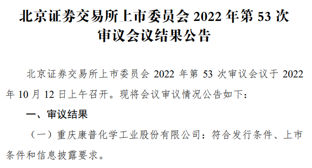 日前,在北交所召开的2022年第53次审议会议上,重庆康普化学工业股份有限公司(简称“康普化学”)符合发行条件、上市条件和信息披露要求,成功过会。