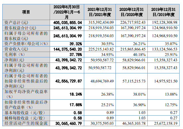 财务数据显示,2019-2021年,康普化学分别实现营业收入1.33亿元、2.16亿元和2.25亿元;归母净利润分别为1535.83万元、5883.00万元和5095.06万元。2022年上半年,营收1.44亿元,同比增长66.41%,净利润为4340万元,同比增长172.44%。