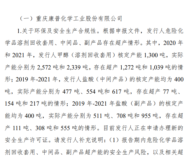 (1)报告期内危险化学品溶剂回收套用、中间品、副产品超产能的安全生产风险,以及相关超产能是否构成重大违法违规行为,是否构成本次公开发行并上市的法律障碍。