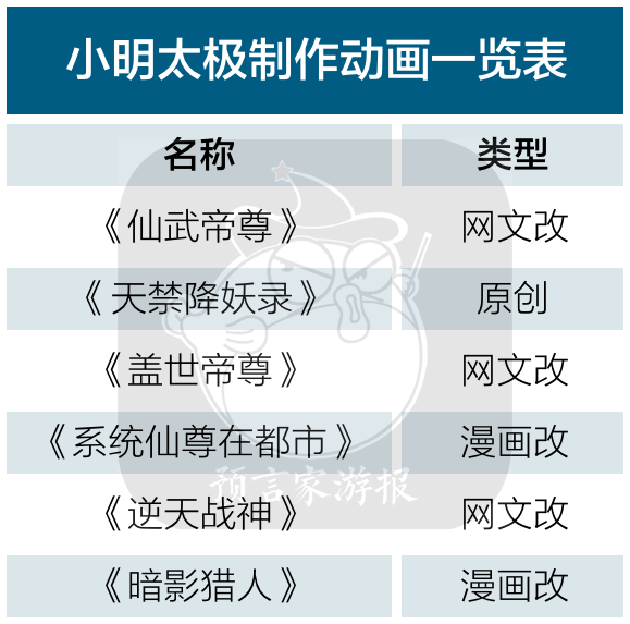 在此次发布的片单中,小明太极凭借自身在漫画IP资源上的优势,负责制作动画作品数量达到了6部,除《天禁降妖录》为原创动画外,其他5部均由网文及漫画改编。