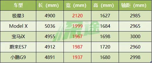 值得一说的是,极星3的车宽达到2120mm,这个车身实在是太宽了。市面上车宽超过2米的SUV不多,Model X是1999mm,蔚来ES7是1987mm,宝马iX是1967mm。极星3比这些车宽了十几公分。