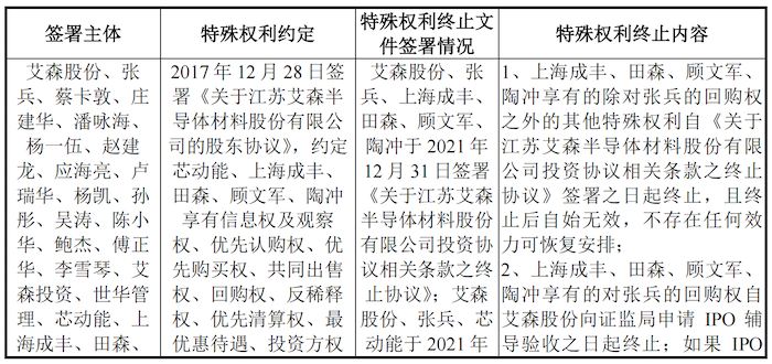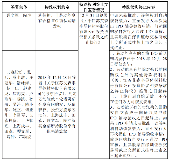 其中,上海成丰、田森、顾文军、陶冲享有的除了对张兵的回购权之外的其他特殊权利已终止,且终止后自始无效,不存在任何效力可恢复安排。但四名自然人享有的对张兵的回购权在艾森股份IPO申请未获批准的情况下将自动恢复效力。