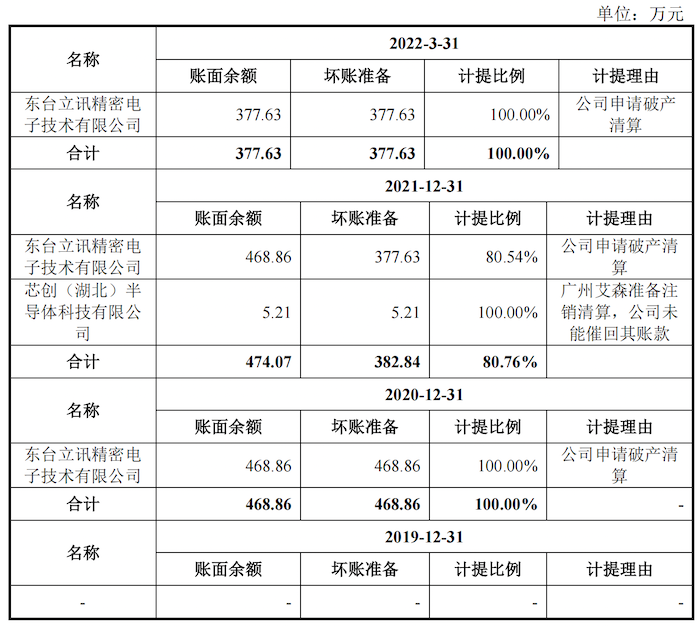 界面新闻记者注意到,艾森股份客户——东台立讯精密电子技术有限公司因公司申请破产清算而分别在2020年至2022年1-3月计提坏账468.86万元、377.63万元和377.63万元。