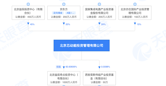 截至报告期期初(2019年),芯动能持有艾森股份10.09%的股份;2019年2月艾森股份第四次增资时,芯动能又以7.34元/股认购艾森股份272.59万股股份,认购金额为1999.99万元,增资完成后,芯动能的持股比例增至14.45%,天眼查显示,京东方持有芯动能20%的股权。