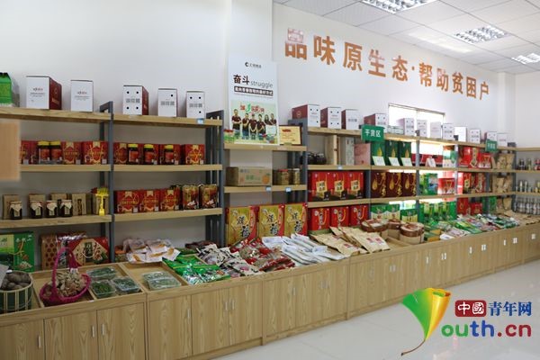 在兴国县凤凰村服务站点,货柜上摆满了兴国县地方特色产品。中国青年网记者 李川 摄