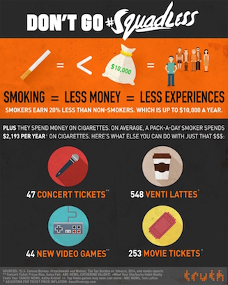 这条说唱视频是由美国戒烟公益机构美国传统协会(American Legacy Foundation)”推出的“Truth”主题宣传的新广告。而广告片中的夸张剧情可并不只是危言耸听。根据调查发现,有吸烟习惯的青少年通常教育水平比较低,进入社会之后通常比未吸烟者的收入低20%。而较少的收入意味着难以负担起和同龄人出去玩耍的费用,逐渐成为失群的状态。