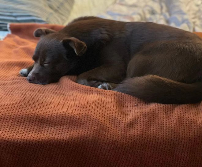 就这样,在被子没到的这几天,我睡觉的时候,都会在床脚上铺一个棕黄色的毯子,专门用来给狗狗睡觉。以前我们都是各睡各的,但最近我经常把枕头搬过去,凑近熟睡的狗子,然后把我的手搭在她翻开的肚皮上,或者把脚伸过去。实际上,当我每次靠近狗子时,我就已经能感觉到她周围的空气都是热的。
