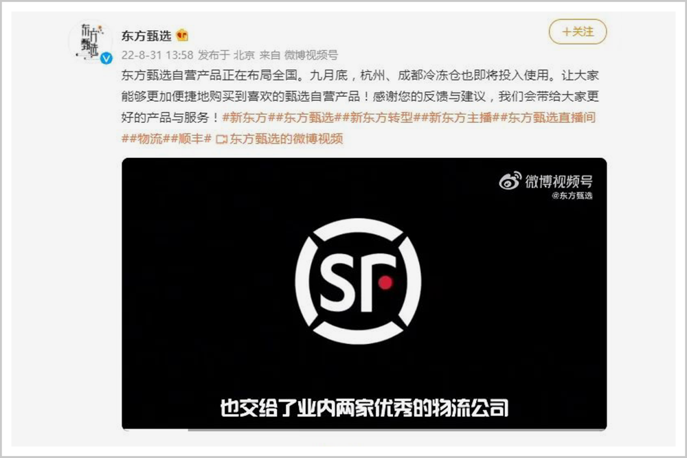 2022年8月31日,东方甄选宣布与顺丰物流、京东物流达成紧密合作伙伴关系,在北京、广州、杭州、郑州、成都5个城市,计划建立20个自营产品仓库,为自营产品提供面向全国的物流服务保障,会优先派送东方甄选直播间商品。