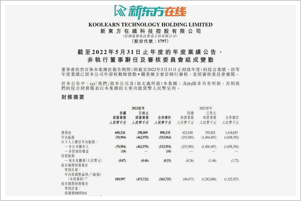 报告期里,新东方在线实现了8.985亿元人民币的营业收入,同比下降了36.66%,净利润上,比2021年收窄了67.8%的亏损幅度,但仍然亏掉了5.34亿元。