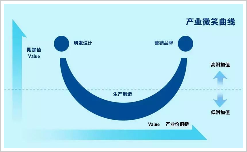 中国台湾企业家施振荣曾经提出“微笑曲线”理论,将产业甚至产品的价值分为研发设计、生产制造、品牌行销三个环节,研发和行销是更能产生附加值的曲线。