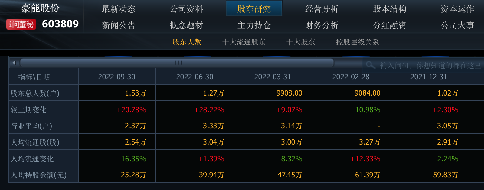 股东户数方面,截至9月末豪能股份的股东总户数为1.53万户,较6月末的1.27万户增加了20.78%。实际上6月末的数据较3月末的数据也有28.22%的增长,3月末时的股东总户数9908户。