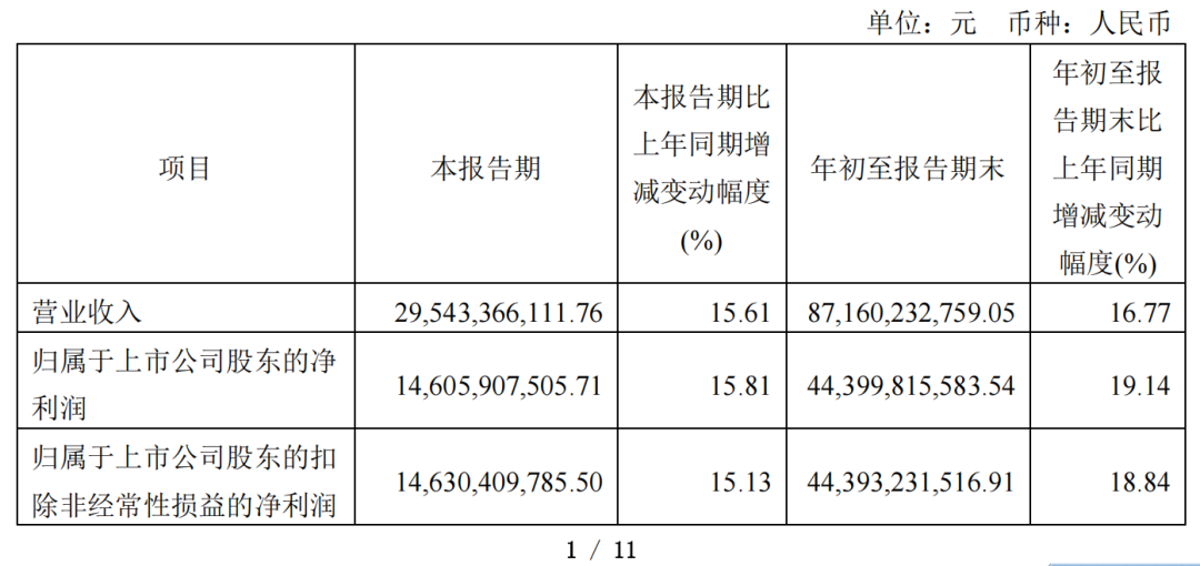 今日(10月16日),贵州茅台正式披露三季报。报告显示,贵州茅台前三季度实现营收871.60亿元,同比增长16.77%,净利润444.00亿元,同比增长19.14%。其中,在第三季度(Q3)贵州茅台实现营收295.43亿元,同比增长15.61%,净利润146.06亿元,同比增长15.81%。