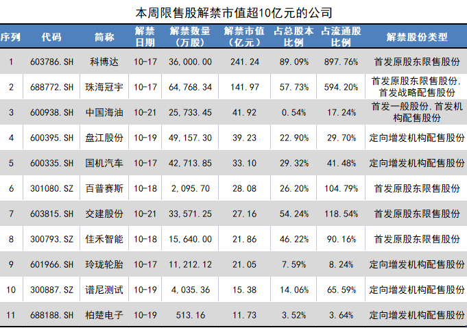 根据公告,车载控制器龙头科博达10月17日有3.60亿股首发限售股解禁,约合解禁市值241.24亿元。解禁数量占比极大,占总股本比例89.09%,解禁后公司流通盘大增约9倍。