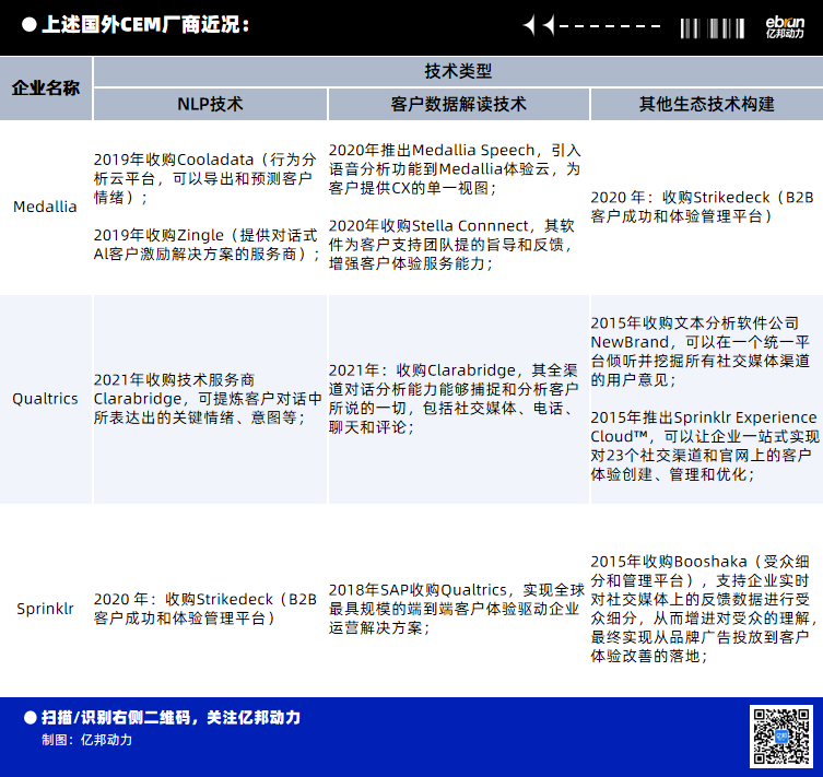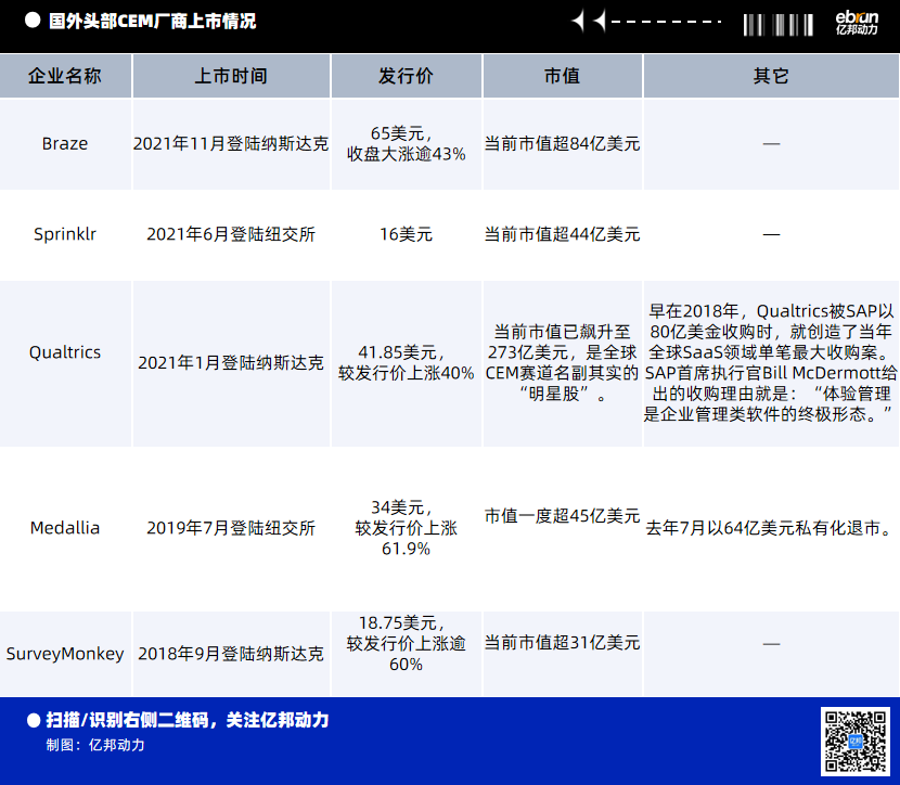 此外,在北美500亿以上美元规模的CEM市场中,还有一众独角兽级别厂商活跃其中,如MarITCX、InMoment、Clarabridge、Comfirmit等。