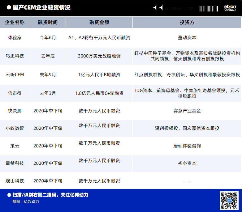 目前,国产CEM赛道主要参与方包括初创型科技企业、大数据企业、传统咨询及问卷公司转型;融资轮次主要集中在天使轮至B轮之间,最高融资数额高达亿元人民币。可以说,资本的涌入点燃了国产CEM加速的引线。