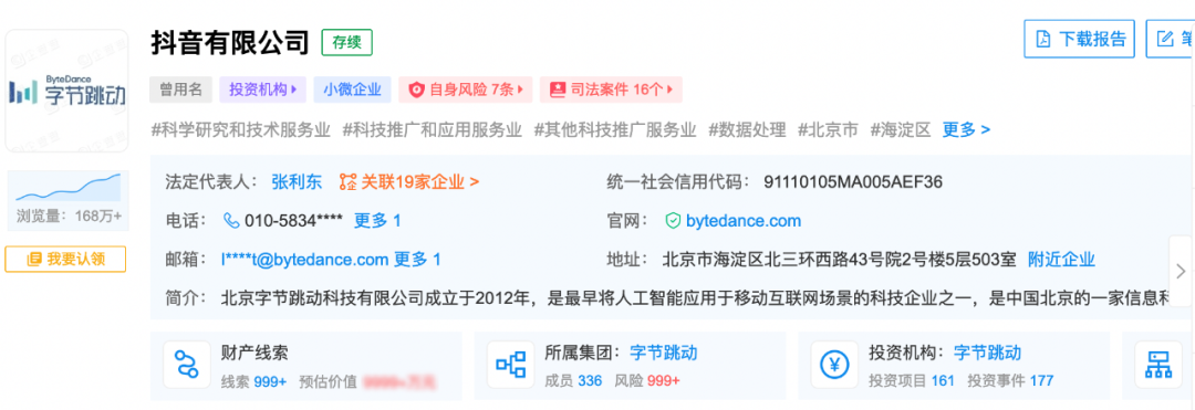 根据企查查信息显示,字节跳动集团的主公司已由原先的“字节跳动有限公司”更名为“抖音有限公司”,而包括北京字节跳动科技有限公司等在内的多家公司也陆续替换名称为“抖音”,旗下业务如飞书、今日头条、火山引擎、量子跃动等所属字节跳动集团的公司也变更为“抖音”控股。
