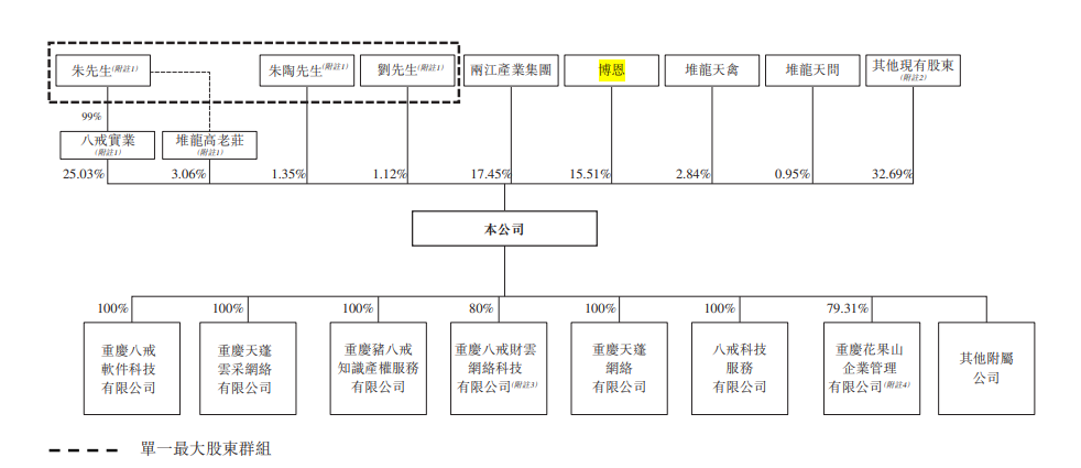 IPO前,朱明跃(透过八戒实业及堆龙高老庄)、刘川郁及朱陶先生分别持有公司已发行股本总额约28.09%、1.12%及1.35%,三人一共持股约30.55%,共同构成控股股东。