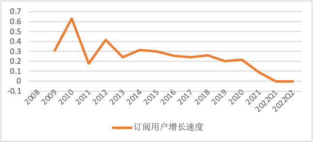 随着会员费用的增加,会员人数增长速度减缓,直至趋近于0,会员人数到达极值之后反而会下降:自2011年,Netflix对流媒体业务实行每月7.99美元的单独收费开始,一共经历了7次调价,期间会员增速显著下降。去年末,会员人数达到顶点,共2.2亿人次。今年开始,会员数量负增长,共减少了117万。