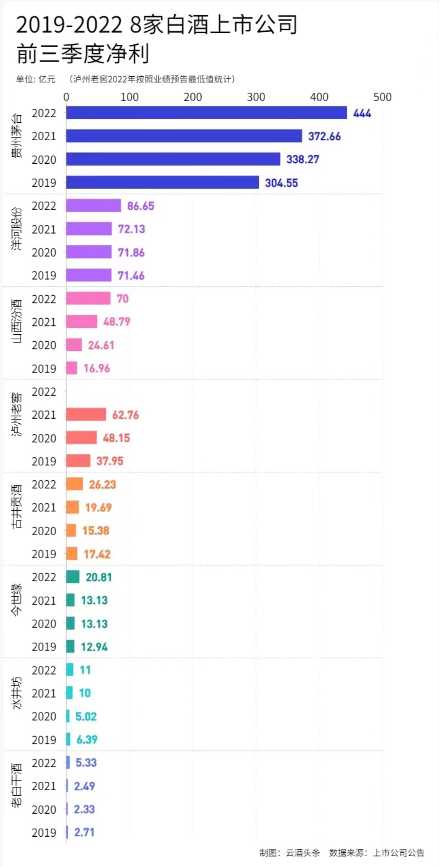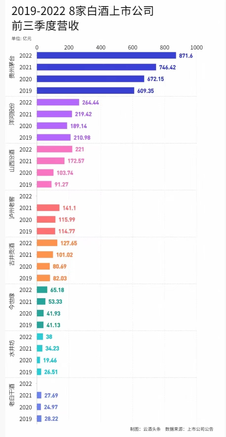 事实上,近年来白酒上市公司的业绩表现,也为上述判断提供了有力支撑。对比2019年-2022年前三季度业绩数据,除了2020年,部分酒企业绩受到疫情影响有所下滑以外,其余年份均呈现出稳步增长的态势。