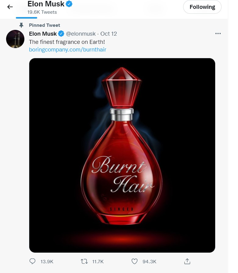 前不久,马斯克在推特上表示,旗下一家隧道建设公司即将开售一款香水新品,名为烧焦的头发(Burnt Hair)。
