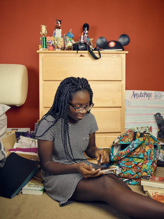 家住休斯敦的Ubakum今年15岁,是个爱笑的漂亮姑娘。戴眼镜的她很是健谈,在回答我的问题时,也丝毫不避讳。她告诉我,自己每天几乎一半的时间都会花在手机上。在我采访过的所有孩子中,只有她还在使用安卓手机。跟Lara和Sofia姐妹俩一样,Ubakum也不喜欢用Facebook和朋友聊天,他们只在和成年人交流的时候,偶尔使用一下。