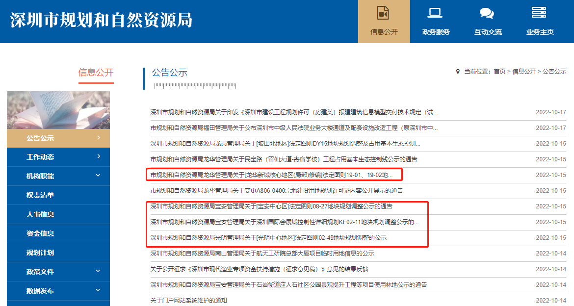 10月15日,深圳市规划和自然资源局发布关于龙华新城核心地区、宝安中心区、宝安国际会展城、光明中心区地块调整。