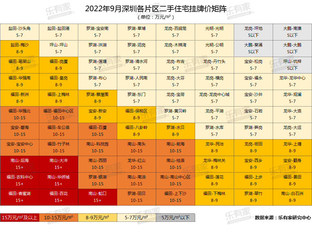 乐有家研究中心对深圳10个行政区的各片区按最新业主售价进行了排序,分成了五大梯队,分别为:5万元/平方米以下,5-7万元/平方米,8-9万元/平方米,10-15万元/平方米,以及15万元/平方米以上。