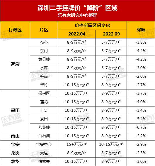 据乐有家研究中心统计数据显示,2022年初及最新的深圳各片区二手房价矩阵图显示,有不少区域价格出现了变动,甚至出现了降等级、降阶梯的情况。
