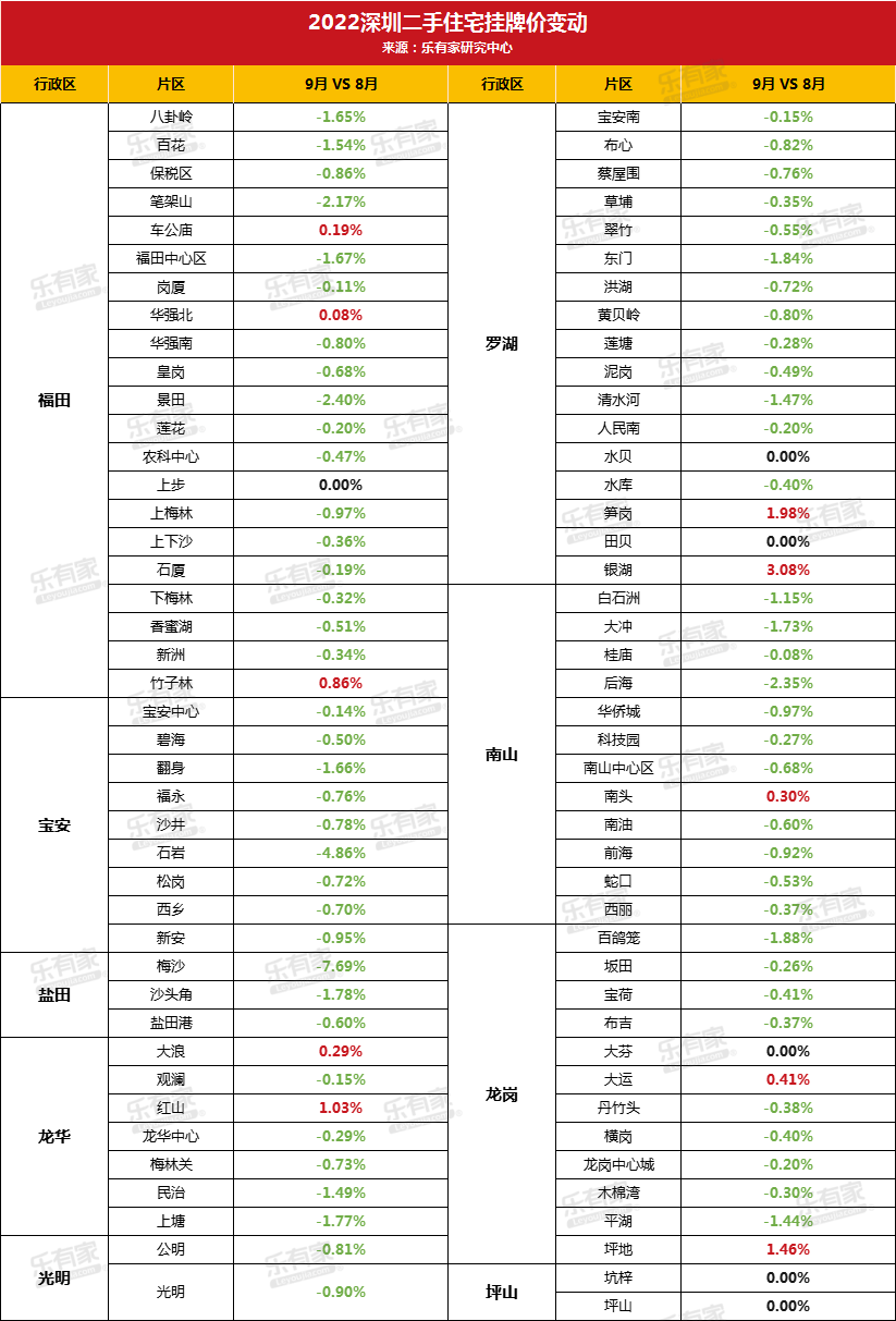 从乐有家研究中心整理的9月挂牌价环比变化表中可看出,实际上全市绝大多数片区的二手挂牌价呈现下跌,但因暂未影响到所属价格区间的变化,故没有纳入表格。