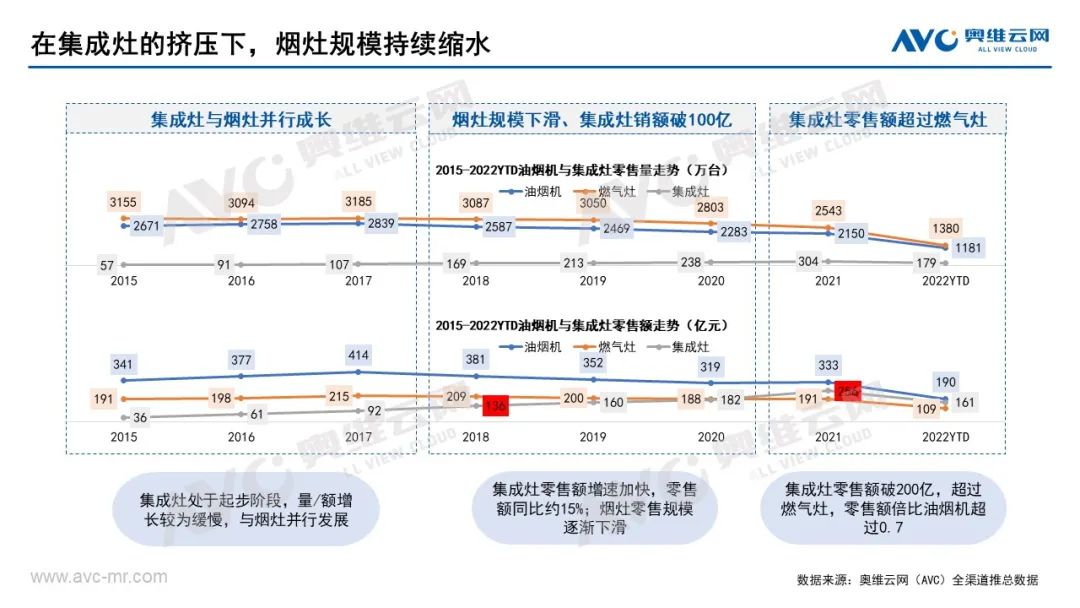 经历多年高速发展后,中国家电市场已从增量时代进入存量时代。奥维云网(AVC)推总数据显示,2022年1-8月,中国家电市场(不含3C)零售规模4516亿,同比下滑6.9%。多数成熟家电品类零售额规模出现了大幅下降趋势。但在此背景下集成灶却表现亮眼,今年累计零售额增长6.2%,成为了为数不多的增长品类。