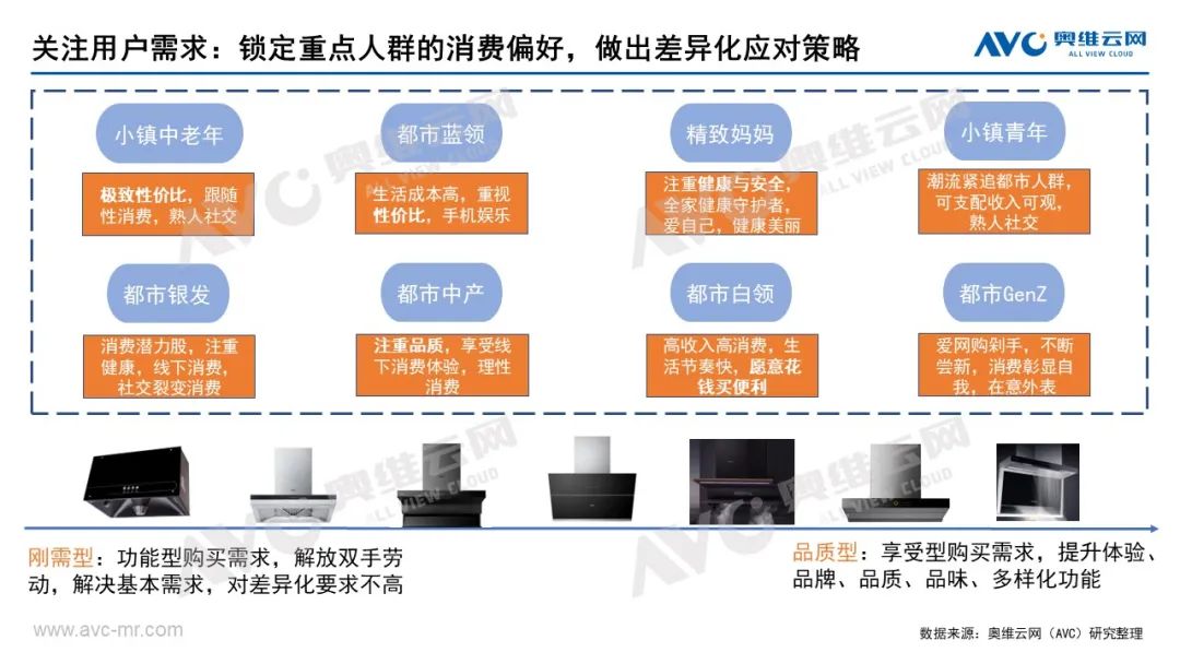 厨电主力消费人群扩圈,从60、70后转移到80后,现在90后、95后也成为了消费主力群体,而市场上也有各种不同款式的产品可以随意选择:对于关注性价比、想解决基本需求的人来说可以提供T型、侧吸式等款式;对于关注外形、关注品质的人,可以推荐顶侧双吸、超薄低吸、跨界等款式;注重健康的人,可以推荐大吸力、大风压,吸烟排烟效果好的产品;注重体验感、科技化的人群可以推荐智能化产品。